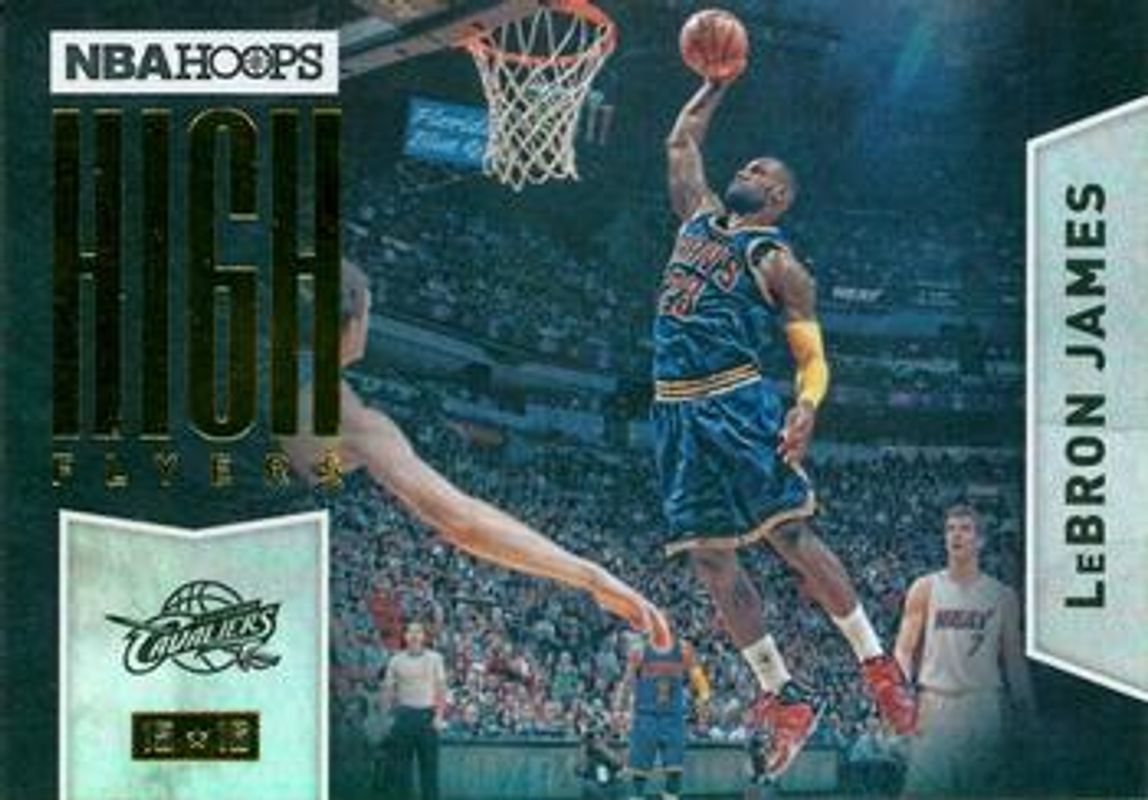 The LeBron James 2015 Hoops #1 High Flyers card is 1 of 38 LeBron James' card variations in the 2015 Hoops set being tracked by Sports Card Investor, including Base, Gold, Green, Red Back, and Blue /399.