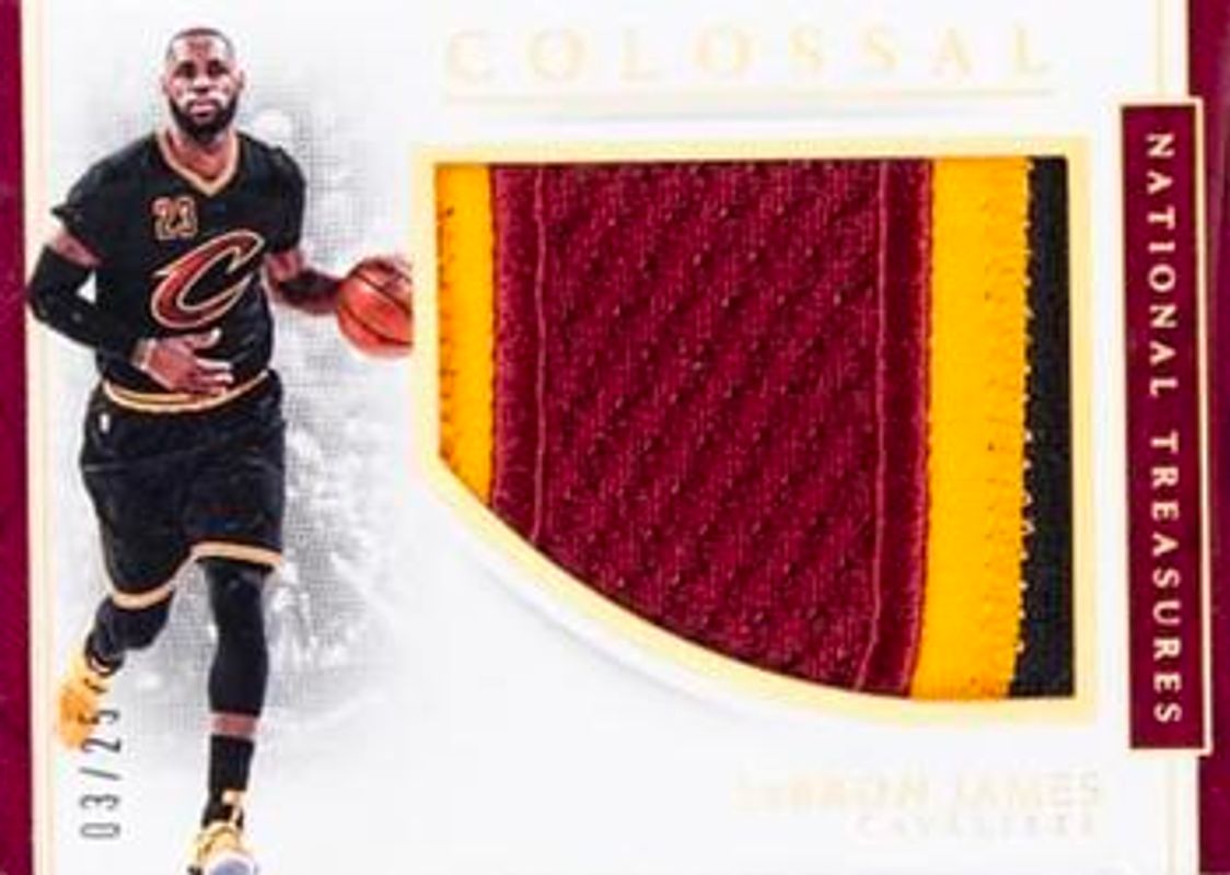The LeBron James 2016 National Treasures #25 Colossal Materials - Prime /25 card is 1 of 48 LeBron James' card variations in the 2016 National Treasures set being tracked by Sports Card Investor, including Base /99, Bronze /25, Gold /10, Emerald /5, and Platinum /1.