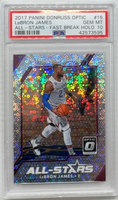The LeBron James 2017 Optic #15 All-Stars - Fast Break card is 1 of 50 LeBron James' card variations in the 2017 Optic set being tracked by Sports Card Investor, including Base, Blue Velocity, Checkerboard, Fast Break, and Holo.