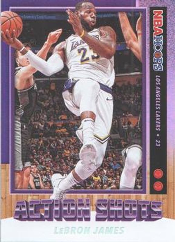 The LeBron James 2019 Hoops #4 Action Shots card is 1 of 44 LeBron James' card variations in the 2019 Hoops set being tracked by Sports Card Investor, including Base, Premium Box Set /199, Black Artist's Proof /1, Back Stage Pass, and Back Stage Pass - Blue.