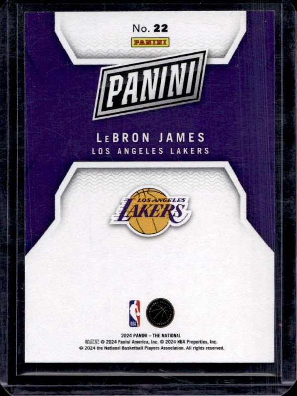 The LeBron James 2024 Panini NSCC Wrapper Redemption #22 Blue /50 card is 1 of 14 LeBron James' card variations in the 2024 Panini NSCC Wrapper Redemption set being tracked by Sports Card Investor, including Base, Foil, Orange /199, Red /99, and Cracked Ice /25.