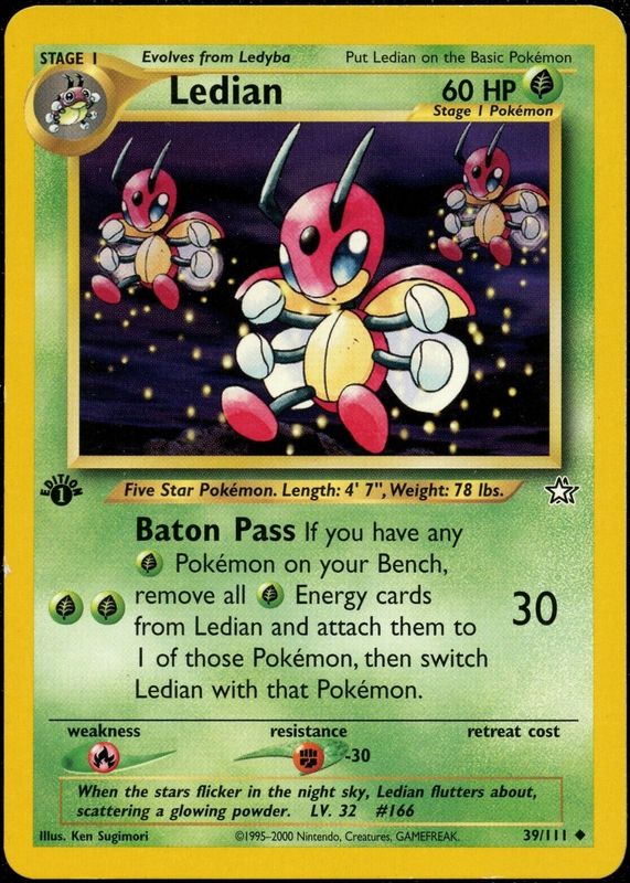 The Ledian 2000 Neo Genesis #39/111 1st Edition card in Raw TCG (Near Mint) condition has moved up $0.76 (+14.5%) in the last 30 days and was last sold for $6.00 .
