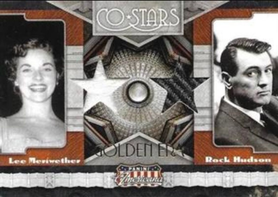 The Lee Meriwether / Rock Hudson 2011 Panini Americana Retail #4 Co Stars Material Silver Screen /99 card is 1 of 3 Lee Meriwether / Rock Hudson's card variations in the 2011 Panini Americana Retail set being tracked by Sports Card Investor, including Co Stars Material /199, and Co Stars Material Golden Era /3.