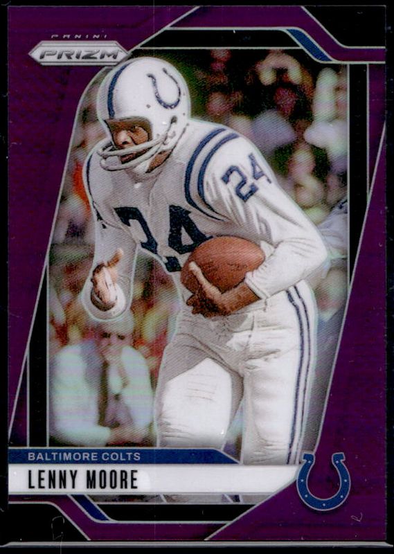 The Lenny Moore 2024 Prizm #296 Purple /125 card is 1 of 84 Lenny Moore's card variations in the 2024 Prizm set being tracked by Sports Card Investor, including Base, Choice Blue Yellow Green, Choice Silver, Disco, and Green.