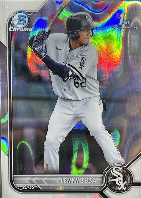 This card is 1 of 40 Lenyn Sosa's card variations in the 2022 Bowman set being tracked by Sports Card Investor, including Chrome Prospects (1st), Chrome Prospects - Refractor /499 (1st), Chrome Prospects - Speckle Refractor /299 (1st), Chrome Prospects - Purple RayWave Refractor /250 (1st), and Chrome Prospects - Purple Refractor /250 (1st).