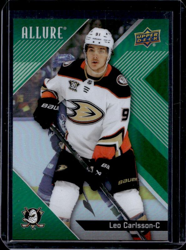 The Leo Carlsson 2024 Upper Deck Allure #26 Green Rainbow /99 card is 1 of 26 Leo Carlsson's card variations in the 2024 Upper Deck Allure set being tracked by Sports Card Investor, including Base, Black Rainbow, Flying Puck, Glitter Bomb, and Orange Slice.