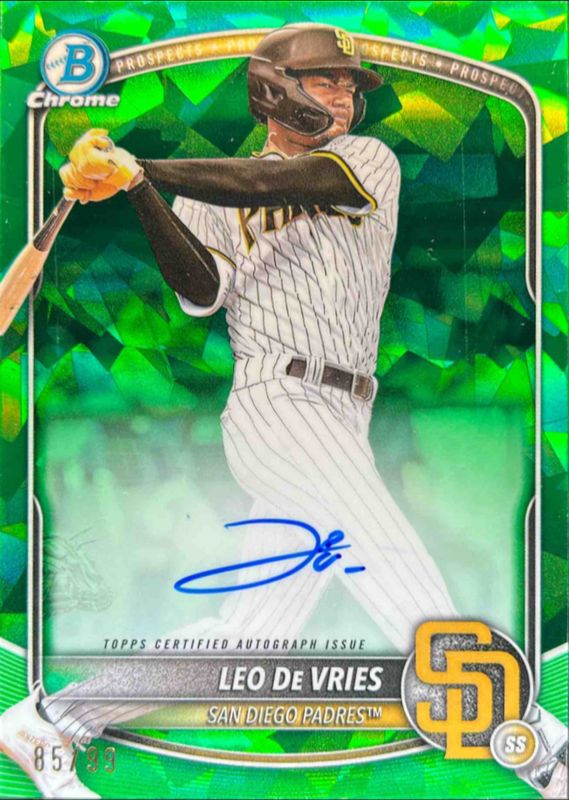 The Leo De Vries 2025 Bowman Sapphire Edition #CPS-LD Chrome Prospect Autographs - Green Refractor /99 card is 1 of 25 Leo De Vries' card variations in the 2025 Bowman Sapphire Edition set being tracked by Sports Card Investor, including Chrome Prospects, Sapphire Selections, Sapphire Selections Autographs, Chrome Prospect Autographs /199, and Chrome Prospects - Green Refractor /99.