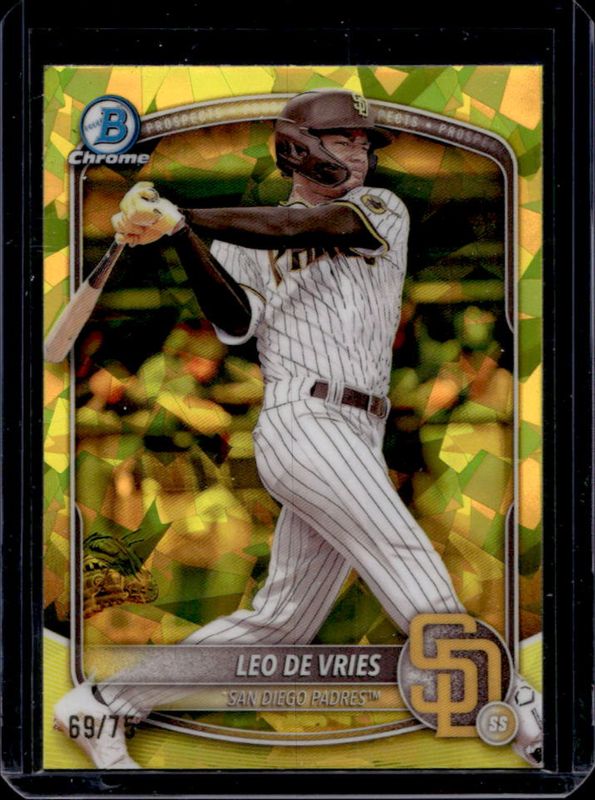 The Leo De Vries 2025 Bowman Sapphire Edition #BCP-59 Chrome Prospects - Yellow Refractor /75 card is 1 of 25 Leo De Vries' card variations in the 2025 Bowman Sapphire Edition set being tracked by Sports Card Investor, including Chrome Prospects, Sapphire Selections, Sapphire Selections Autographs, Chrome Prospect Autographs /199, and Chrome Prospect Autographs - Green Refractor /99.