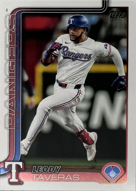 The Leody Taveras 2025 Topps #50 Base card is 1 of 63 Leody Taveras' card variations in the 2025 Topps set being tracked by Sports Card Investor, including Aqua Holo Foil, Diamante Foil, Holo Foil, Pink Diamante Foil, and Pink Holo Foil.