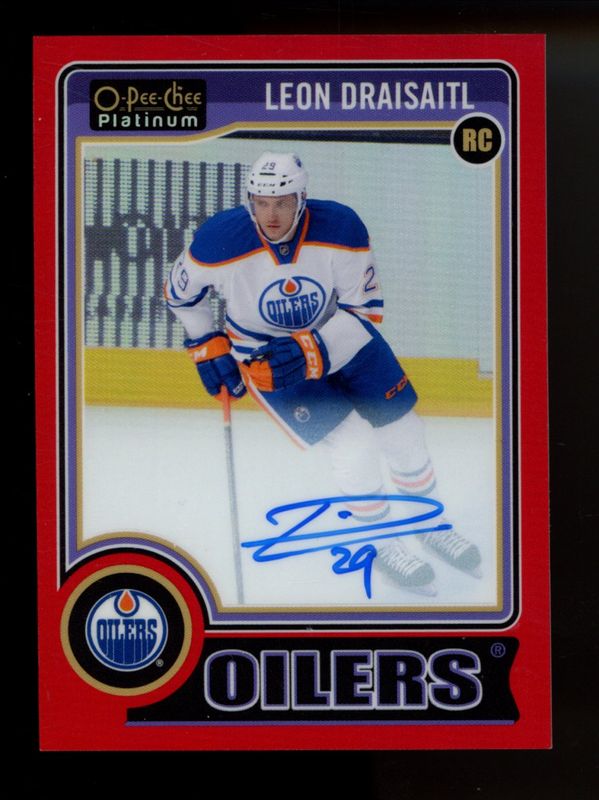 The Leon Draisaitl 2014 O-Pee-Chee Platinum #RA-5 Rookie Autographs - Red Rainbow /50 card is 1 of 25 Leon Draisaitl's card variations in the 2014 O-Pee-Chee Platinum set being tracked by Sports Card Investor, including #159a Base, #159b Base, #159 Platinum Traxx, #159 Rainbow, and #159 White Ice /199.