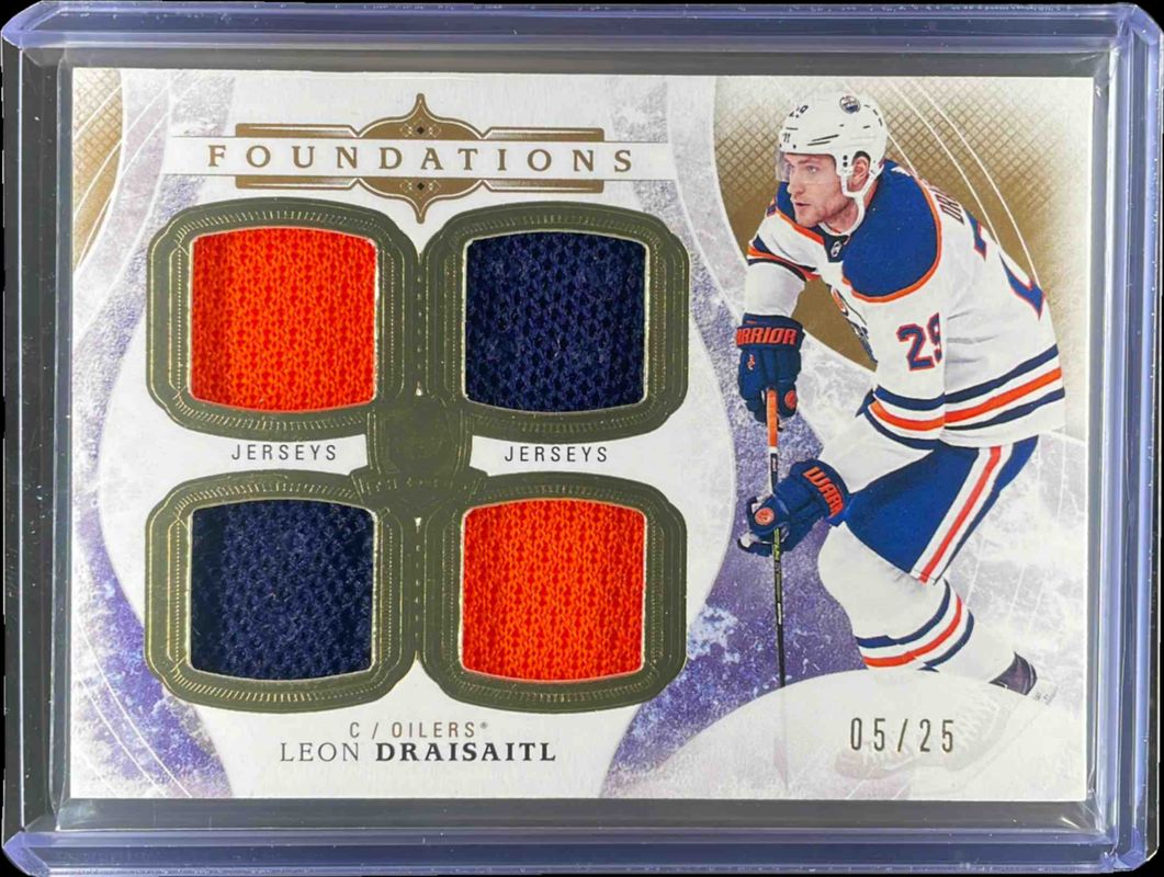 The Leon Draisaitl 2017 Upper Deck The Cup #F-LD Cup Foundations Jersey /25 card is 1 of 22 Leon Draisaitl's card variations in the 2017 Upper Deck The Cup set being tracked by Sports Card Investor, including Base /249, Gold Spectrum Foil /36, Gold Foil Patch /24, Red Foil Tag /8, and Green Foil Button /3.