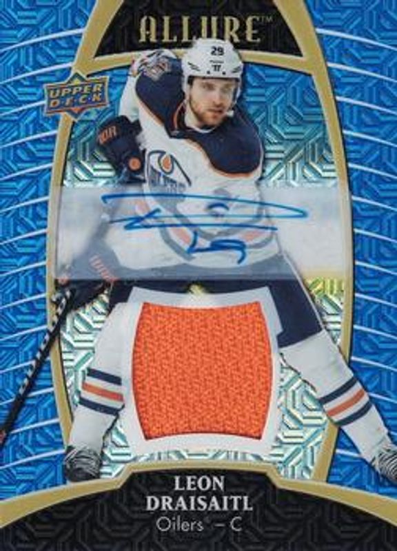 The Leon Draisaitl 2019 Upper Deck Allure #37 Blue Line Autographs Jersey Relics /25 card is 1 of 29 Leon Draisaitl's card variations in the 2019 Upper Deck Allure set being tracked by Sports Card Investor, including Base, Pewter, Red Rainbow, White Rainbow, and Yellow Taxi.