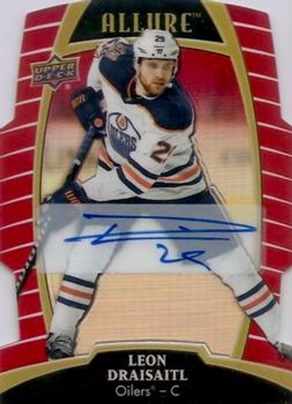 The Leon Draisaitl 2019 Upper Deck Allure #37 Red Rainbow Autographs /349 card is 1 of 29 Leon Draisaitl's card variations in the 2019 Upper Deck Allure set being tracked by Sports Card Investor, including Base, Pewter, Red Rainbow, White Rainbow, and Yellow Taxi.