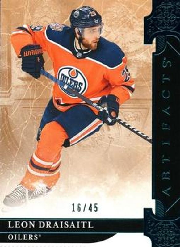 The Leon Draisaitl 2019 Upper Deck Artifacts #144 Aqua /45 card is 1 of 22 Leon Draisaitl's card variations in the 2019 Upper Deck Artifacts set being tracked by Sports Card Investor, including Base /999, Ruby /399, Copper /299, Emerald /99, and Purple /20.