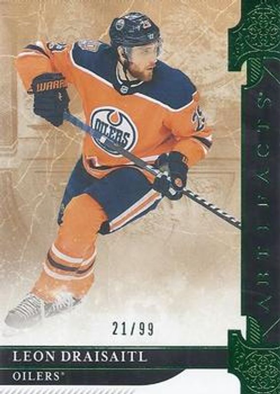 The Leon Draisaitl 2019 Upper Deck Artifacts #144 Emerald /99 card is 1 of 22 Leon Draisaitl's card variations in the 2019 Upper Deck Artifacts set being tracked by Sports Card Investor, including Base /999, Ruby /399, Copper /299, Aqua /45, and Purple /20.