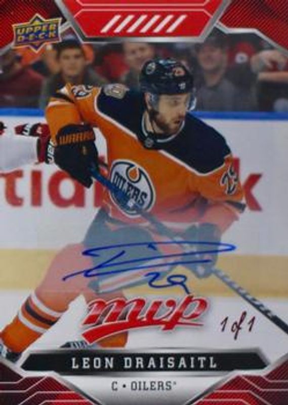 The Leon Draisaitl 2019 Upper Deck MVP #210 Autographs Leaderboard Achievements Red /1 card is 1 of 20 Leon Draisaitl's card variations in the 2019 Upper Deck MVP set being tracked by Sports Card Investor, including Base, Blue, Gold Script, Silver Script, and Super Script /25.