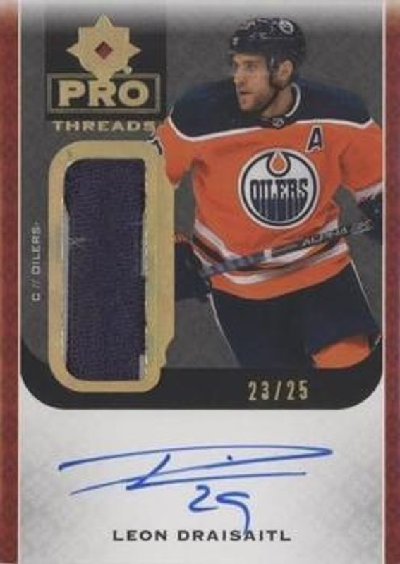 The Leon Draisaitl 2019 Upper Deck Ultimate Collection #PT-LD Pro Threads /25 card is 1 of 15 Leon Draisaitl's card variations in the 2019 Upper Deck Ultimate Collection set being tracked by Sports Card Investor, including Base /299, Autographs, Onyx Black /10, Autographed Shields /1, and Autographs Onyx Black /1.