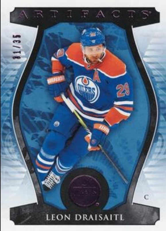 The Leon Draisaitl 2023 Upper Deck Artifacts #23 Pink /35 card is 1 of 23 Leon Draisaitl's card variations in the 2023 Upper Deck Artifacts set being tracked by Sports Card Investor, including Base /999, Turquoise, Ruby /499, Copper /299, and Royal Blue /199.