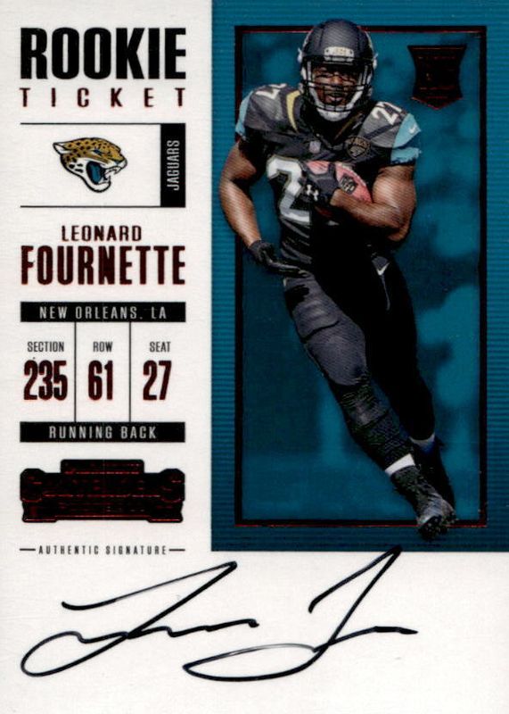 The Leonard Fournette 2017 Contenders #310 Rookie Ticket Auto - Red Zone Ticket card in Raw condition has not changed in price in the last 30 days and was last sold for $8.50 .