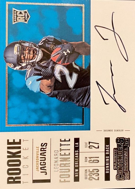 The Leonard Fournette 2017 Contenders #350 Rookie Ticket Auto Variation card in Raw condition has not changed in price in the last 30 days and was last sold for $9.99 .
