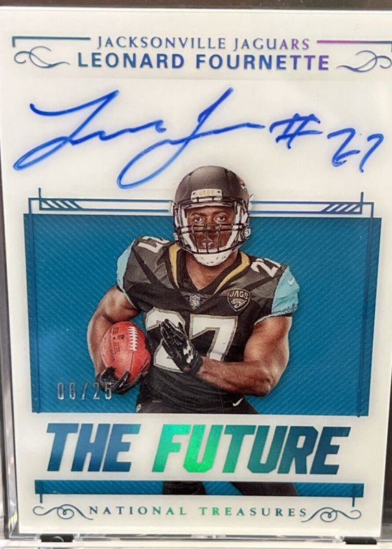 The Leonard Fournette 2017 National Treasures #F-LFN The Future Signatures /25 Rookie card in Raw condition has not changed in price in the last 30 days and was last sold for $8.00 .
