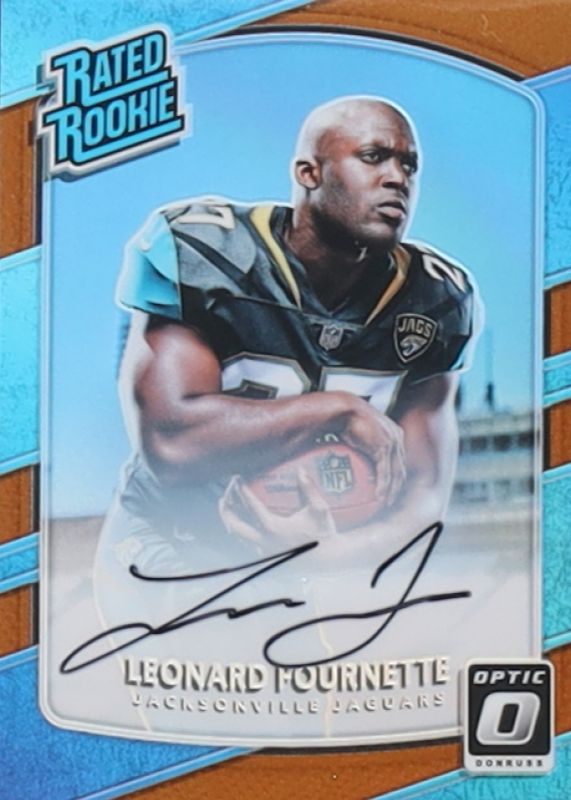The Leonard Fournette 2017 Optic #169 Rated Rookie Autographs - Bronze card in Raw condition has not changed in price in the last 30 days and was last sold for $20.00 .