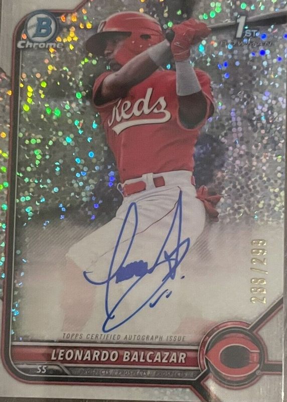 The Leonardo Balcazar 2022 Bowman Chrome #CPA-LB Prospect Auto - Speckle Refractor /299 (1st) card in Raw condition has not changed in price in the last 30 days and was last sold for $12.50 .