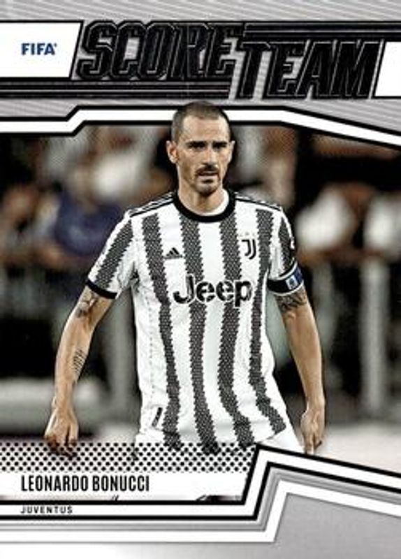 The Leonardo Bonucci 2022 Score FIFA #26 Score Team card is 1 of 5 Leonardo Bonucci's card variations in the 2022 Score FIFA set being tracked by Sports Card Investor, including Score Team - Purple Laser /15, Score Team - Gold Swirl /10, Score Team - Black Laser /1, and Score Team - Black Swirl /1.