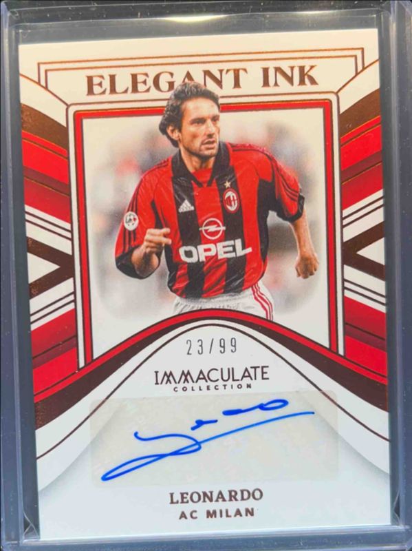 The Leonardo 2023 Immaculate #EI-LO Elegant Ink card is 1 of 12 Leonardo's card variations in the 2023 Immaculate set being tracked by Sports Card Investor, including Elegant Ink - Gold, Elegant Ink - Ruby, Elegant Ink - Sapphire, Elegant Ink - Silver, and Modern Marks.
