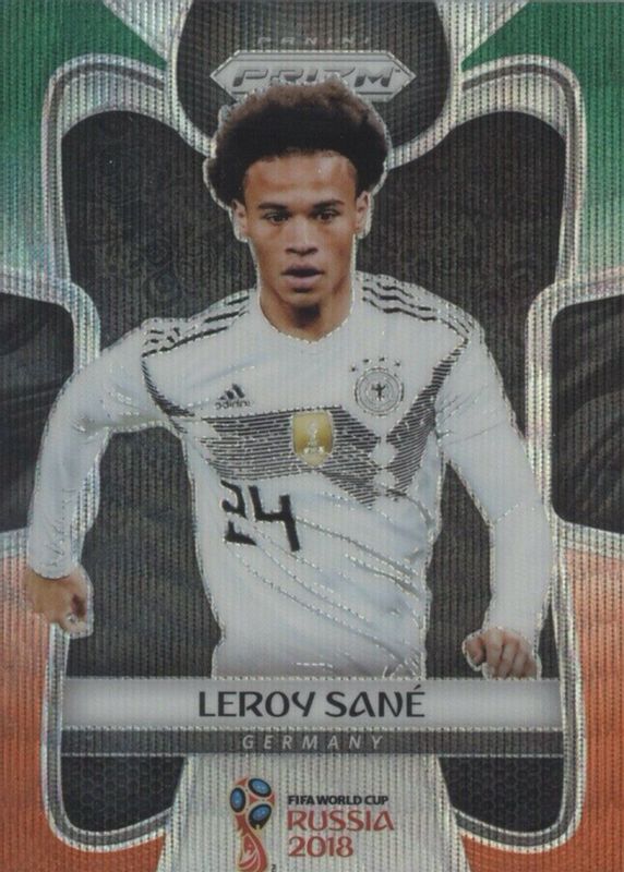 The Leroy Sane 2018 Prizm World Cup #93 Green & Orange Wave card in Raw condition has not changed in price in the last 30 days and was last sold for $7.44 .