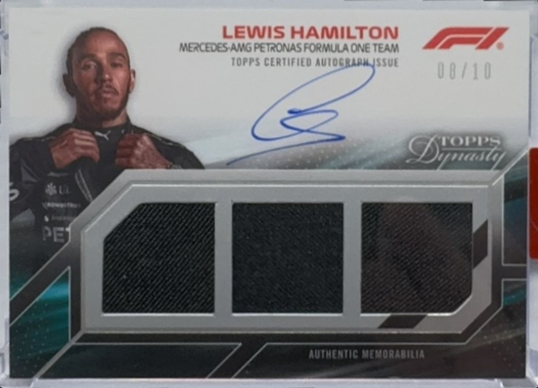 The Lewis Hamilton 2022 Topps Dynasty Formula 1 #SDTRA-LHI Dynasty Single Driver Triple Relic Autographs /10 card is 1 of 26 Lewis Hamilton's card variations in the 2022 Topps Dynasty Formula 1 set being tracked by Sports Card Investor, including #DAP-LH Dynasty Autographs Patch /10, #DAP-LHI Dynasty Autographs Patch /10, #DAP-LHII Dynasty Autographs Patch /10, #SDSRA-LH Dynasty Single Driver Dual Relic Autographs /10, and #SDTRA-LH Dynasty Single Driver Triple Relic Autographs /10.