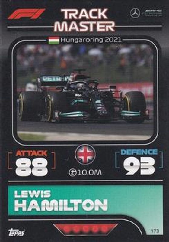 The Lewis Hamilton 2022 Topps Turbo Attax Formula 1 #173 Base card is 1 of 58 Lewis Hamilton's card variations in the 2022 Topps Turbo Attax Formula 1 set being tracked by Sports Card Investor, including #219 Base, #138 Base, #189 Base, #212 Base, and #22 Base.