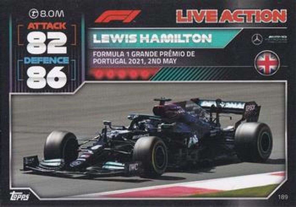 The Lewis Hamilton 2022 Topps Turbo Attax Formula 1 #189 Base card is 1 of 58 Lewis Hamilton's card variations in the 2022 Topps Turbo Attax Formula 1 set being tracked by Sports Card Investor, including #219 Base, #138 Base, #173 Base, #212 Base, and #22 Base.