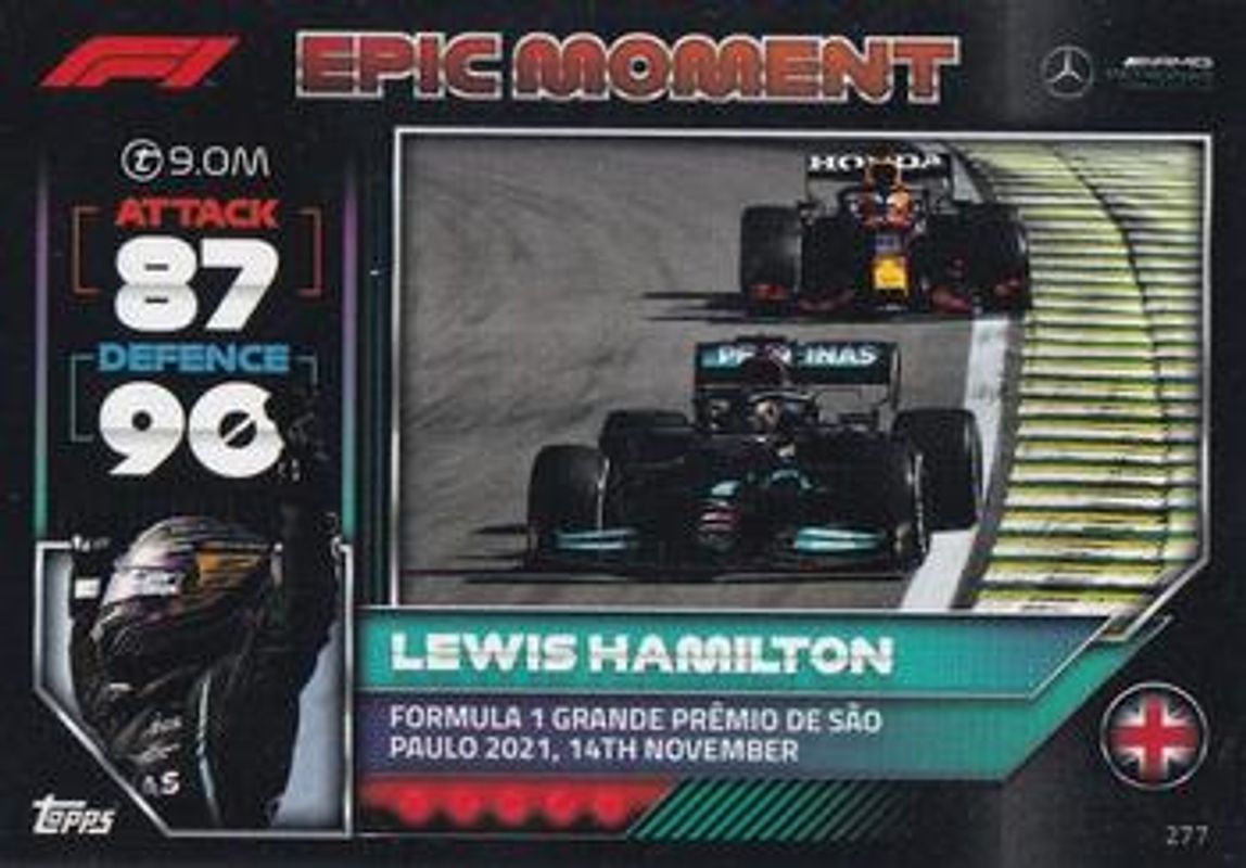 The Lewis Hamilton 2022 Topps Turbo Attax Formula 1 #277 Base card is 1 of 58 Lewis Hamilton's card variations in the 2022 Topps Turbo Attax Formula 1 set being tracked by Sports Card Investor, including #219 Base, #138 Base, #173 Base, #189 Base, and #212 Base.
