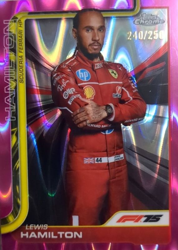 The Lewis Hamilton 2025 Topps Chrome Formula 1 #4 Pink RayWave Refractor /250 card in Raw condition has moved up $0.07 (+0.7%) in the last 30 days and was last sold for $9.57 .