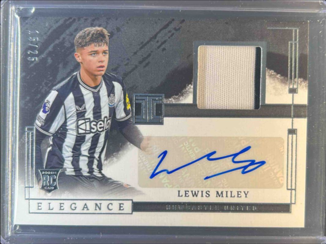 The Lewis Miley 2023 Impeccable Premier League #EJ-LM Elegance Jersey Autographs /99 Rookie card is 1 of 37 Lewis Miley's card variations in the 2023 Impeccable Premier League set being tracked by Sports Card Investor, including Base /62, Sapphire /25, Silver /18, Ruby /15, and Gold /10.