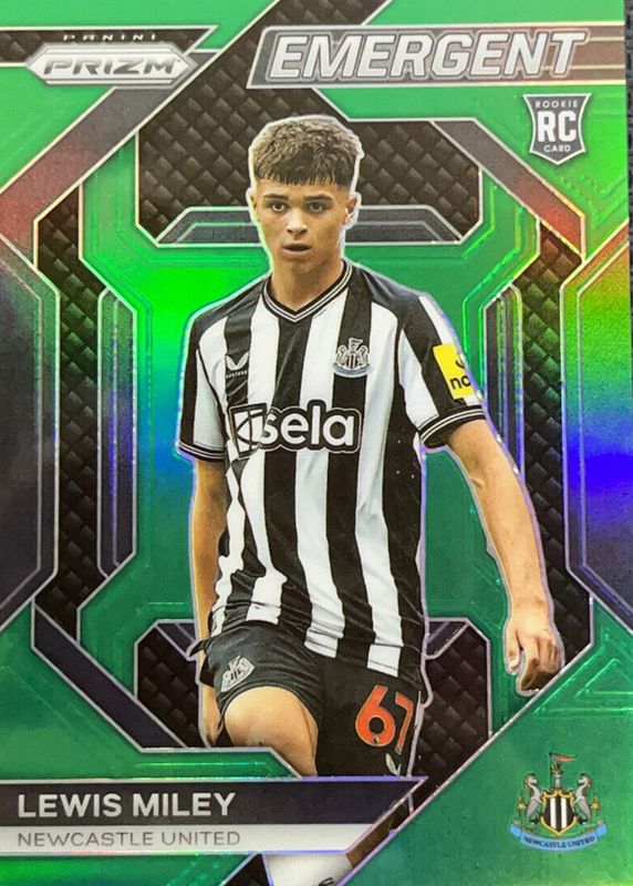 The Lewis Miley 2023 Prizm Premier League #72 Green /5 Rookie card in Raw condition has not changed in price in the last 30 days and was last sold for $204.50 .
