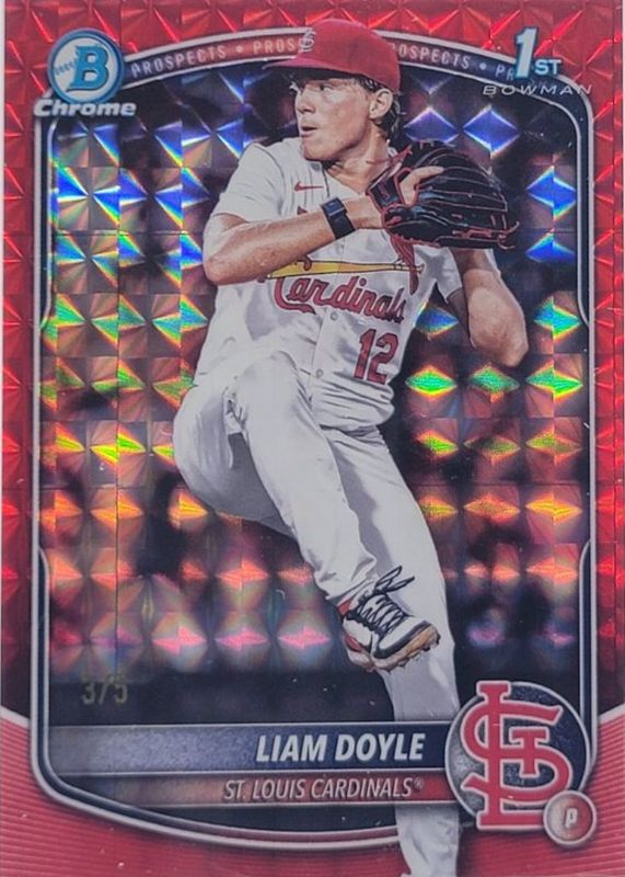 The Liam Doyle 2025 Bowman Draft #BDC-12 Chrome - Red Geometric Refractor /5 (1st) card in Raw condition has not changed in price in the last 30 days and was last sold for $256.02 .