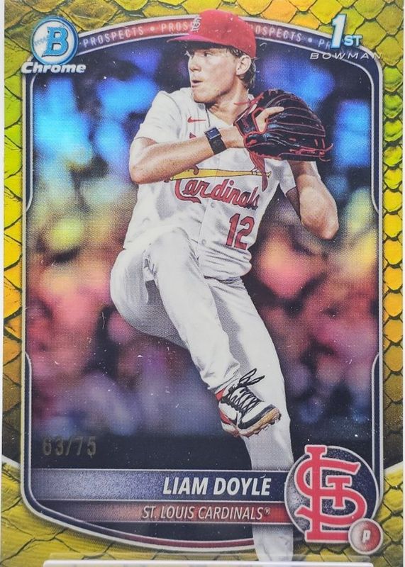 The Liam Doyle 2025 Bowman Draft #BDC-12 Chrome - Yellow Reptilian Refractor /75 (1st) card in Raw condition has not changed in price in the last 30 days and was last sold for $73.75 .
