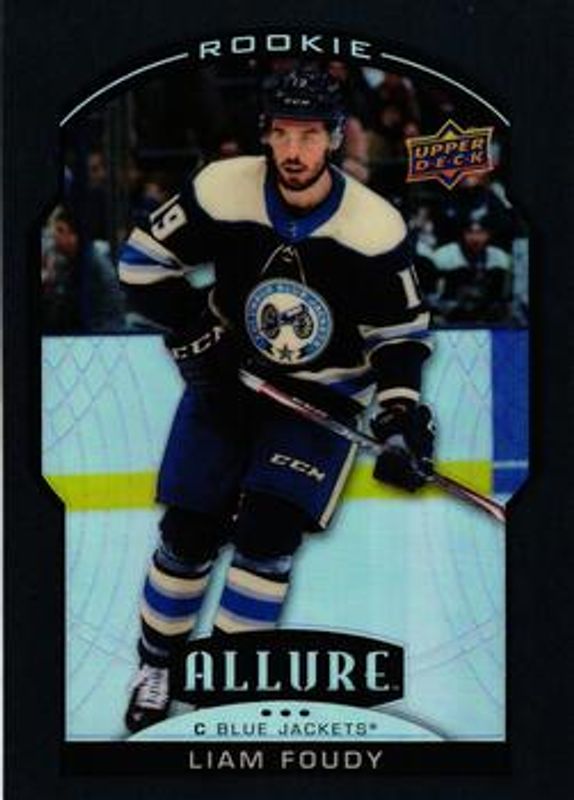The Liam Foudy 2020 Upper Deck Allure #81 Black Rainbow Rookie card is 1 of 59 Liam Foudy's card variations in the 2020 Upper Deck Allure set being tracked by Sports Card Investor, including #106 Base, #81 Base, #81 2005 Shield, #81 Blue China, and #106 Double Rainbow.