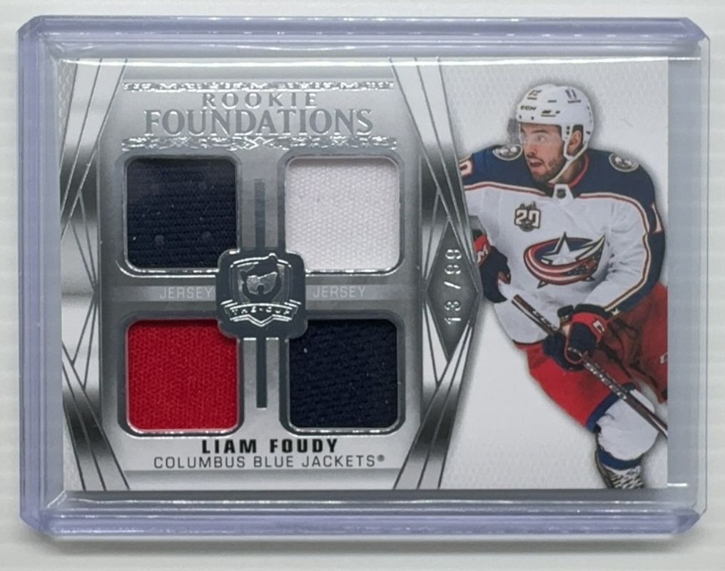 The Liam Foudy 2020 Upper Deck The Cup #F-LF Foundations Quad Jersey /49 Rookie card is 1 of 70 Liam Foudy's card variations in the 2020 Upper Deck The Cup set being tracked by Sports Card Investor, including Base /99, Artist Proof Rookie Class of 2021 Gold Foil Auto Patch, Gold Spectrum Foil /36, Gold Foil /24, and Green Foil /3.