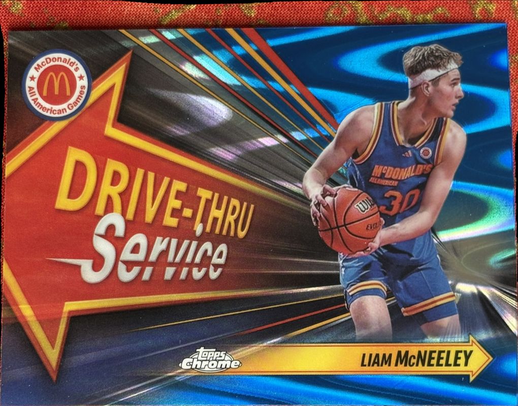 The Liam McNeeley 2024 Topps Chrome McDonald's All-American #DTS-LIM Drive-Thru Service - Blue RayWave Refractor card is 1 of 112 Liam McNeeley's card variations in the 2024 Topps Chrome McDonald's All-American set being tracked by Sports Card Investor, including #80 Base, #30 Base, #30 Blue RayWave Refractor, #80 Blue RayWave Refractor, and #30 McDonald's Logo Refractor.