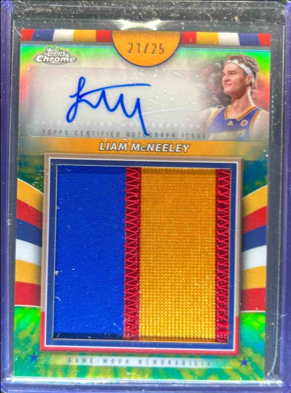 The Liam McNeeley 2024 Topps Chrome McDonald's All-American #GPA-LMC Golden Patch Autographs - Tie-Dye /25 card is 1 of 112 Liam McNeeley's card variations in the 2024 Topps Chrome McDonald's All-American set being tracked by Sports Card Investor, including #80 Base, #30 Base, #30 Blue RayWave Refractor, #80 Blue RayWave Refractor, and #30 McDonald's Logo Refractor.