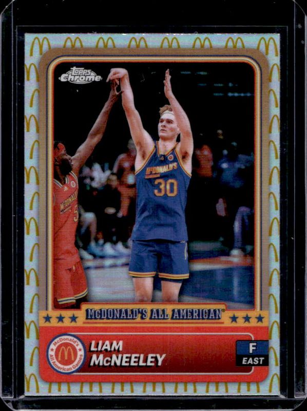 The Liam McNeeley 2024 Topps Chrome McDonald's All-American #30 McDonald's Logo Refractor card is 1 of 112 Liam McNeeley's card variations in the 2024 Topps Chrome McDonald's All-American set being tracked by Sports Card Investor, including #80 Base, #30 Base, #30 Blue RayWave Refractor, #80 Blue RayWave Refractor, and #80 McDonald's Logo Refractor.