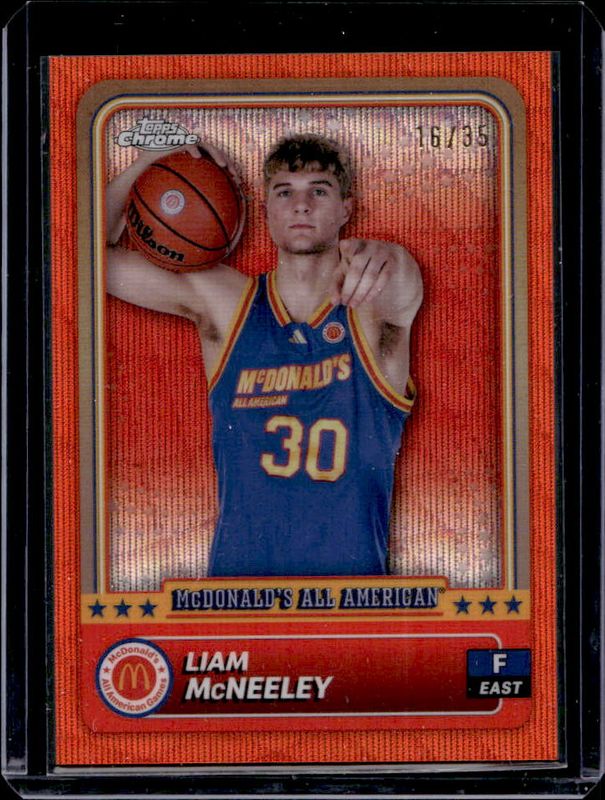 The Liam McNeeley 2024 Topps Chrome McDonald's All-American #80 Orange Wave Refractor /35 card is 1 of 112 Liam McNeeley's card variations in the 2024 Topps Chrome McDonald's All-American set being tracked by Sports Card Investor, including #80 Base, #30 Base, #30 Blue RayWave Refractor, #80 Blue RayWave Refractor, and #30 McDonald's Logo Refractor.