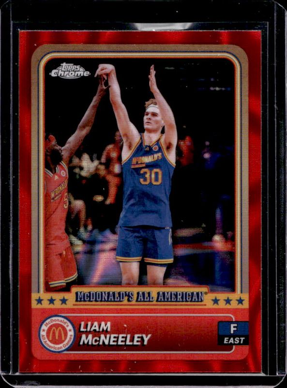 The Liam McNeeley 2024 Topps Chrome McDonald's All-American #30 Red Lava Refractor /125 card is 1 of 112 Liam McNeeley's card variations in the 2024 Topps Chrome McDonald's All-American set being tracked by Sports Card Investor, including #80 Base, #30 Base, #30 Blue RayWave Refractor, #80 Blue RayWave Refractor, and #30 McDonald's Logo Refractor.