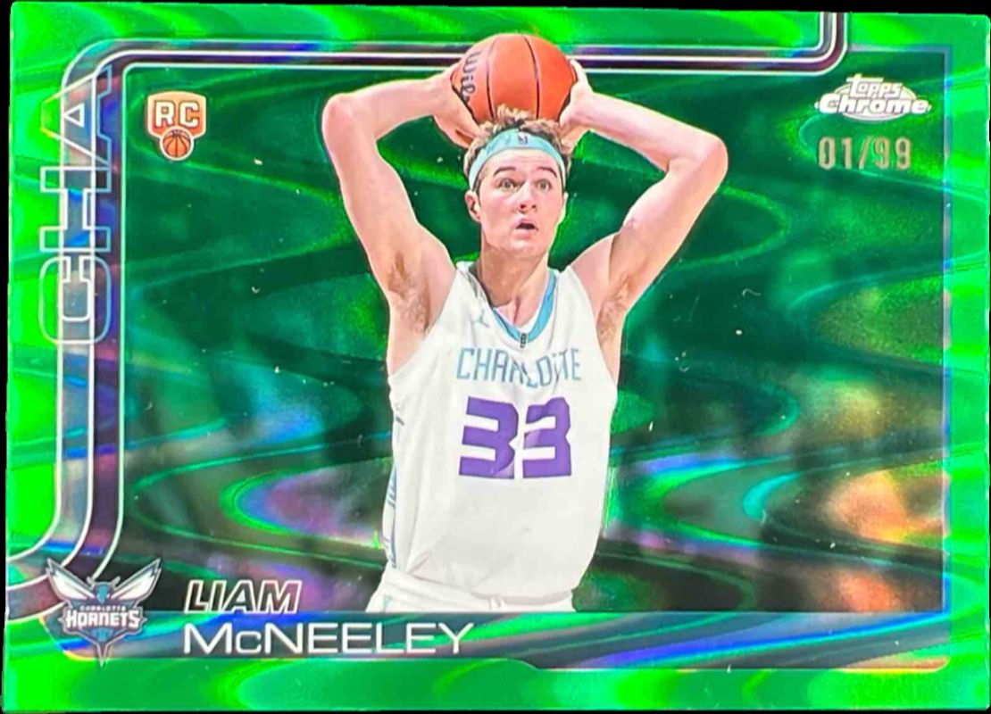 The Liam McNeeley 2025 Topps Chrome #279 Green RayWave Refractor /99 Rookie card is 1 of 216 Liam McNeeley's card variations in the 2025 Topps Chrome set being tracked by Sports Card Investor, including Base, Basketball Refractor, Box Set Refractor, Image Variation, and Lightboard Logo Refractor.