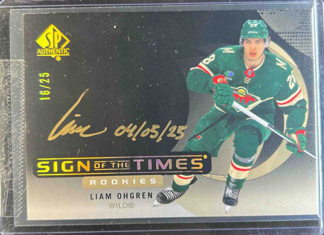 The Liam Ohgren 2024 SP Authentic #SOTTR-LO Sign of the Times Rookies - Black /25 card is 1 of 41 Liam Ohgren's card variations in the 2024 SP Authentic set being tracked by Sports Card Investor, including Base /999, Auto Mystery Black, Future Watch Acetate, Limited Red, and Limited Blue /399.
