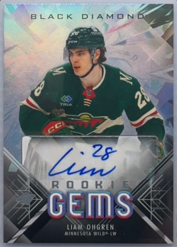The Liam Ohgren 2024 Upper Deck Black Diamond #RGS-LO Rookie Gems Signatures /199 card is 1 of 55 Liam Ohgren's card variations in the 2024 Upper Deck Black Diamond set being tracked by Sports Card Investor, including Base /349, Diamond Relic Rookies /99, Premium Relics /50, Autographs /49, and Diamond Relic Rookies Emerald /10.