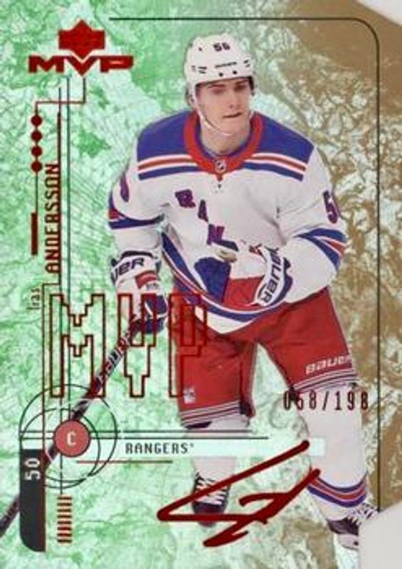 The Lias Andersson 2018 Upper Deck MVP #92 20th Anniversary Colors & Contours /198 Rookie card is 1 of 17 Lias Andersson's card variations in the 2018 Upper Deck MVP set being tracked by Sports Card Investor, including Base, Factory Set Blue, Green Script, Silver Script, and Gold Script /150.